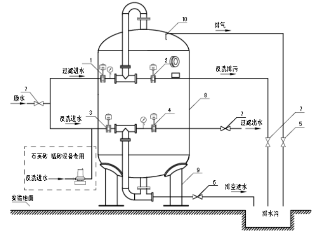 石英砂過濾器選用石英砂作為濾料,過濾效率高,阻力小,處理流量大,反沖次數(shù)少(運行周期是普通過濾器的1-2倍),可以實現(xiàn)全自動運行。